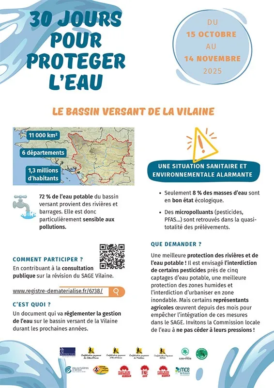 Jusqu'au 14 novembre 2025, il est possible de participer à la consultation publique sur le SAGE Vilaine, document qui va réglementer la gestion de l'eau sur le bassin versant de la Vilaine pendant les prochaines années.