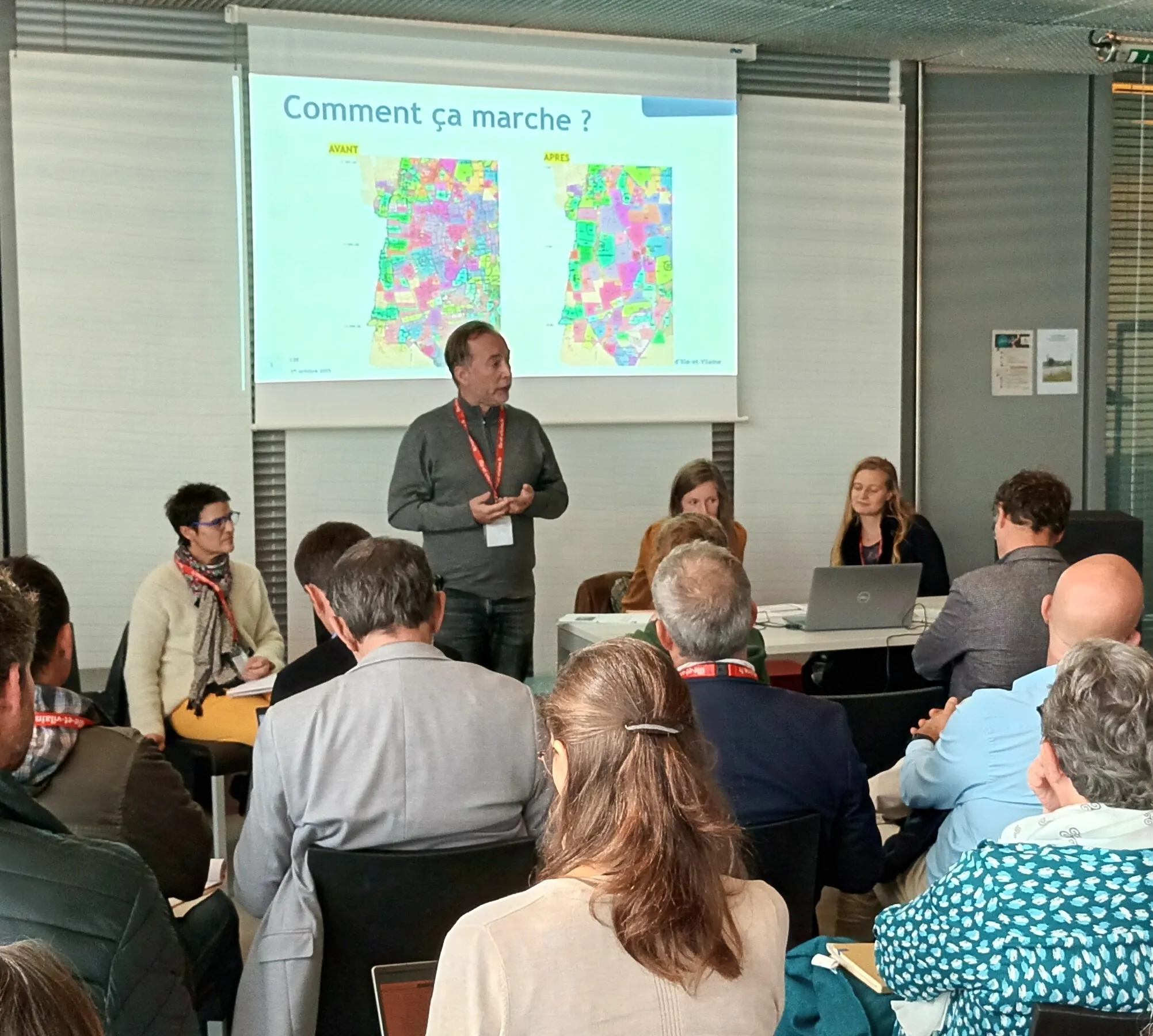 Yann a fait la conclusion de la conférence; il a notamment présenté le dispositif des AFAFE (aménagement foncier, agricole forestier et environnemental) dans l'atelier consacré à l'agriculture.