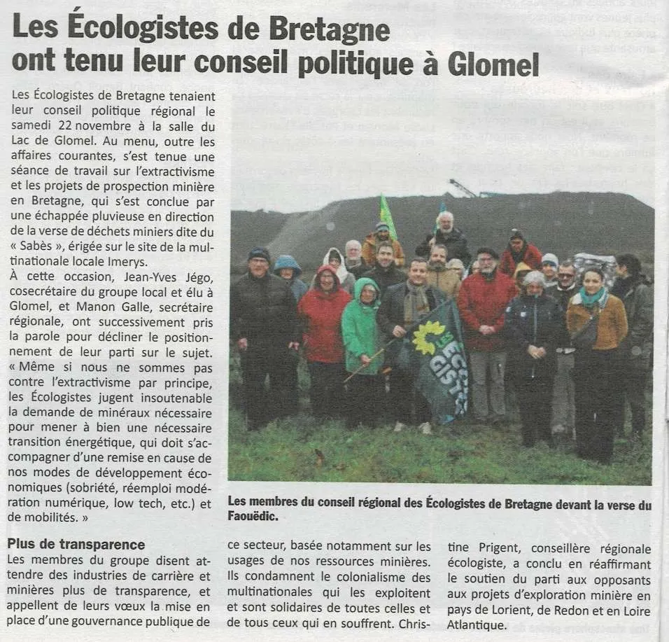 - Samedi 22 novembre, les membres du Conseil Politique Régional (CPR) et militant·es se sont retrouvé·es en centre Bretagne à #Glomel pour une journée de travail avec comme sujet phare l’extractivisme en Bretagne. Le groupe local Kerne-Uhel les ont accueillis. Jean-Yves Jégo, conseiller municipal écologiste de Glomel, a notamment témoigné sur la lutte menée localement et sur les enjeux écologiques et sociaux liés à l’exploitation minière sur une planète aux ressources limitées.
